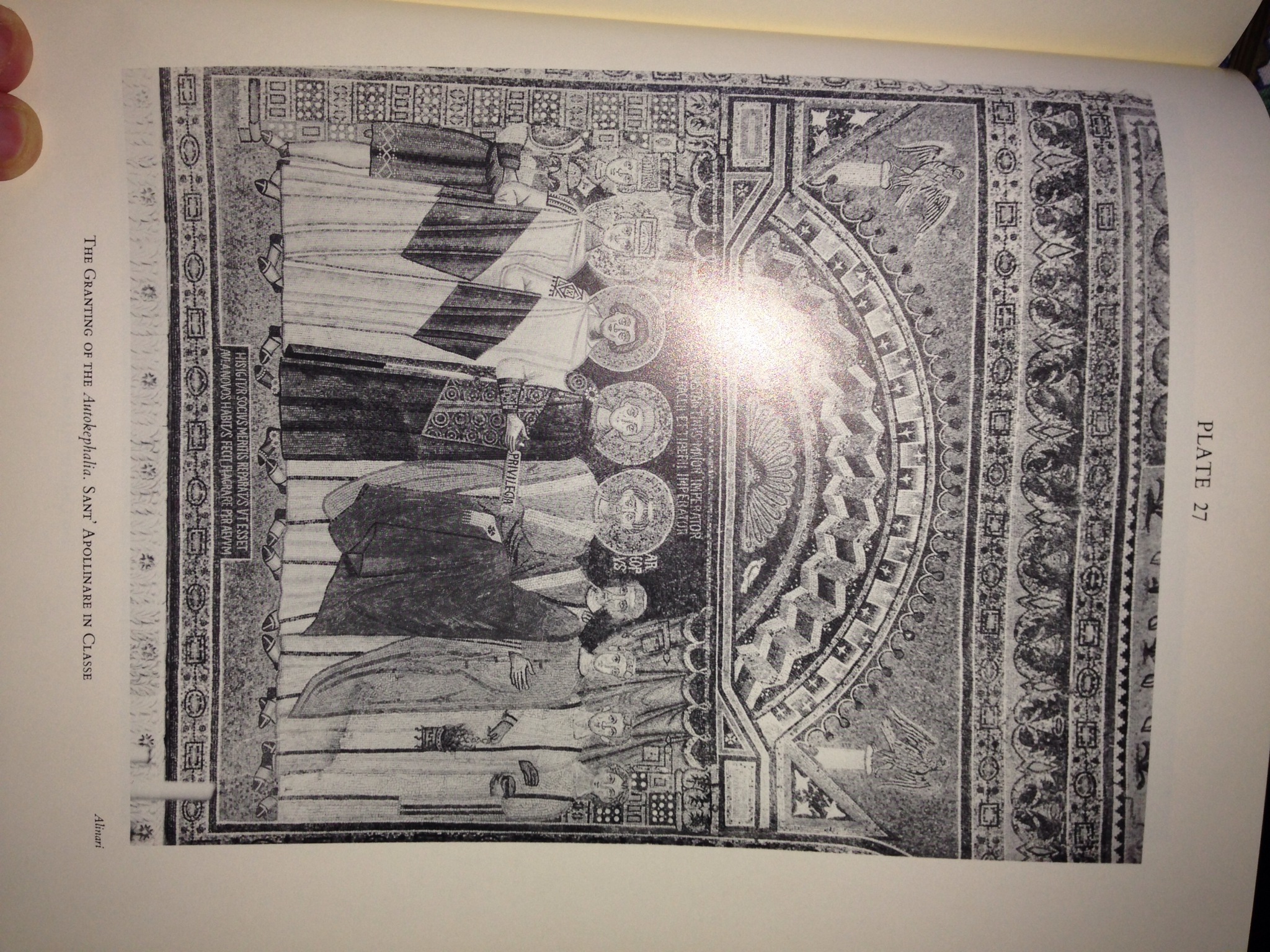 This is a mosaic she refers to as “[a] mosaic from Sant’Appolinare in Classe depicting courtiers wearing the pallium.” The trouble is, it isn’t; it’s the mosaic of Justinian from San Vitale in Ravenna, one of the most identifiable mosaics from Late Antiquity: