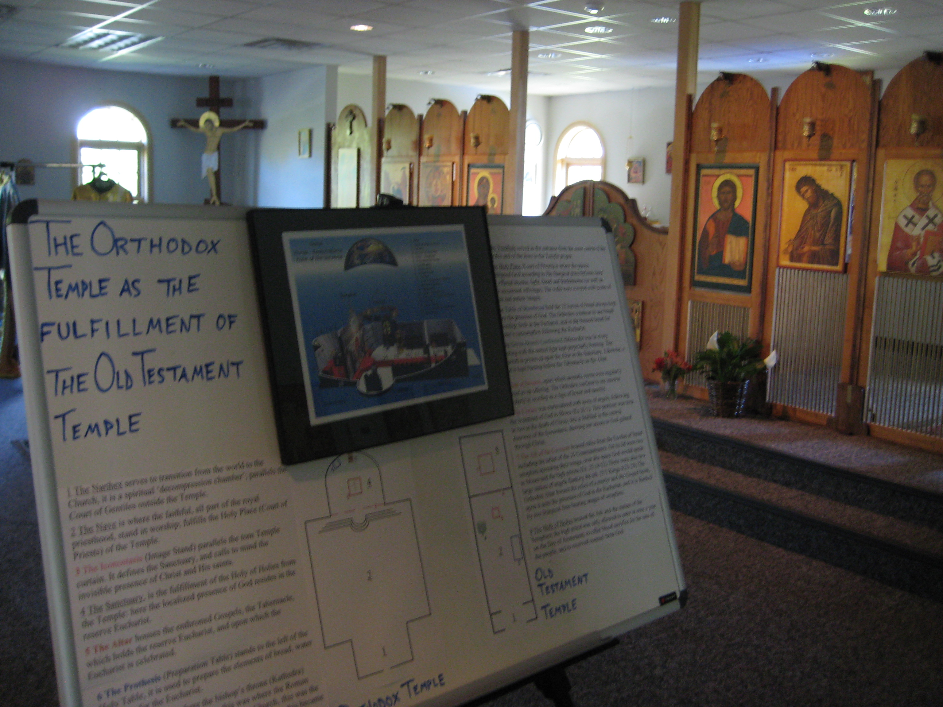 Anyway, here are some of the pictures I took throughout the day. Church tours are, of course, something we do, and there’s an information board we post relating the interior of an Orthodox church building to the interior of the Jewish temple. The big colorful image (blown up below) is, shall we say, a rather idealized digital model of a traditional Byzantine structure. I agree with my godson Lucas (who put the board together, and conducted the tours) that it would be nice if there were formal diocesan guidelines for building churches something along the lines of “come as close to this as you possibly can”; alas, much of Byzantine church architecture seems to assume the existence of an Emperor and his treasury, and the readiness of same to pay for things. Very tough for a smallish working class community to be able to come anywhere near this (as you can see from the acoustic tiles filling in for the dome).