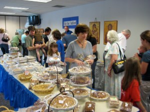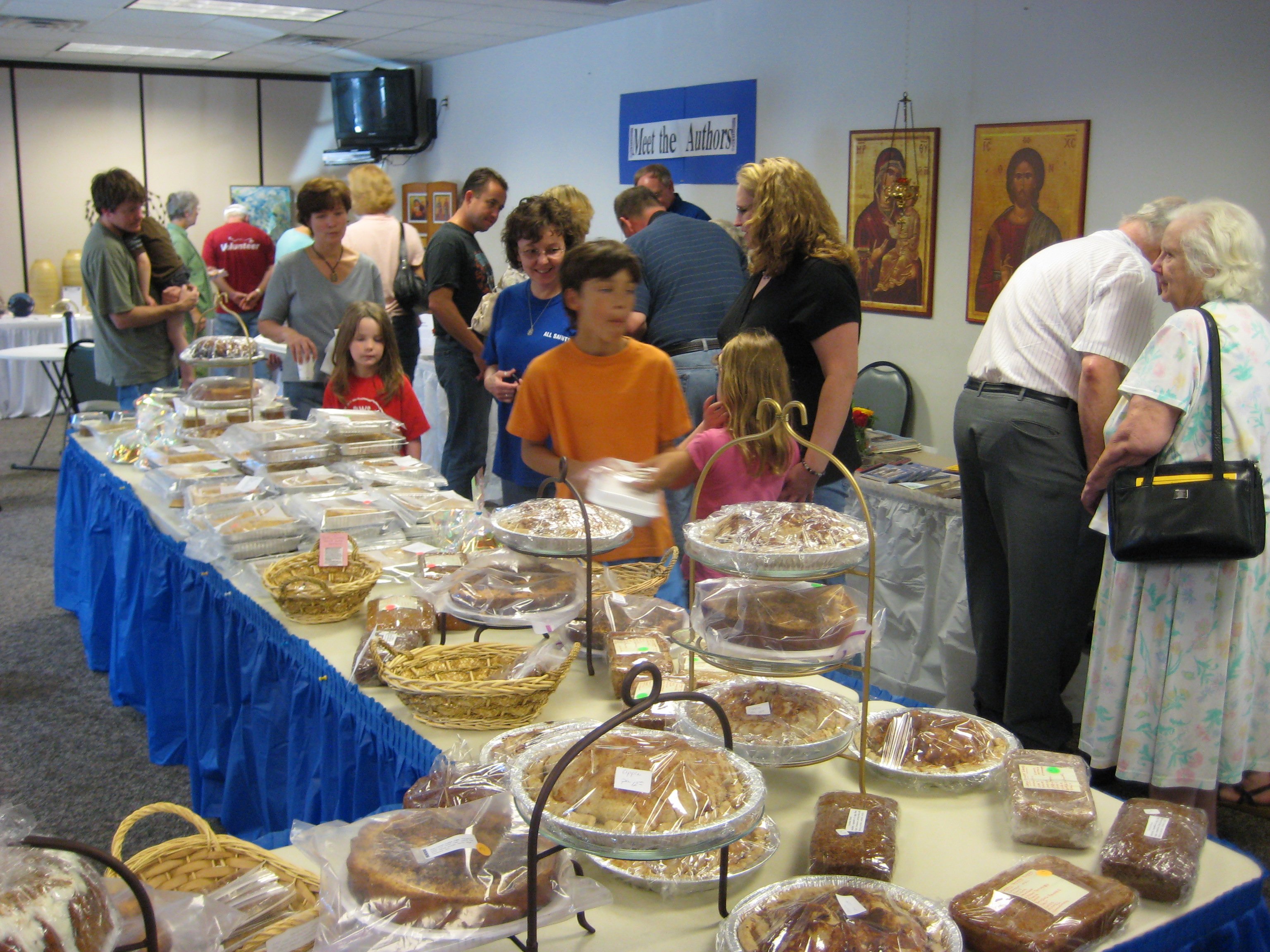 Besides tours of the nave, we also had the bake shop and silent auction inside the church. You want baklava? We’ve got baklava. Or, well, at least we did. You snooze, you lose. The parish bookstore was also open for business, and we had copies of Cappella Romana‘s The Divine Liturgy in English for sale and displayed prominently, natch.